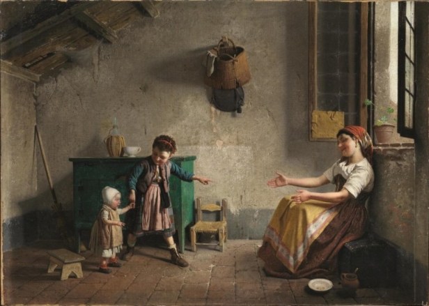 “Muovere i primi passi è un evento grandioso, come pronunciare la prima parola, o imparare ad allacciarsi le scarpe da soli. Il camminare per la prima volta smettendo di gattonare è il soggetto del dipinto del quale vi voglio parlare oggi: I primi passi dipinto da Gaetano Chierici. Il quadro è un olio su tela del 1871 appartenente alla collezione Leone Minassian di Venezia.”