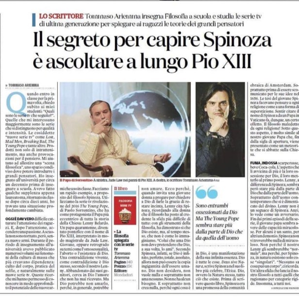 “Spinoza si percepiva come un rivoluzionario. Un suo biografo racconta il fascino che la rivolta a Napoli nel 1647, capeggiata da Masaniello, aveva esercitato su di lui: Spinoza disegna un ritratto del rivoltoso napoletano, ma il viso assomiglia più a Spinoza che a Masaniello. Il filosofo è, dunque, consapevole della forza rivoluzionaria del proprio pensiero. Come se un meteorite all’improvviso si fosse abbattuto sulla sua comunità. Sotto questo aspetto, è molto simile al nostro giovane papa, che, fin dalla sigla di apertura della serie, viene presentato proprio come un meteorite che si abbatte sulla Chiesa. Fuma, indossa scarpe rosse che danno nell’occhio, a colazione beve solo una Coca-Cola zero. Mangia poco e, come dice il cardinale-macchietta Voiello, segretario dello Stato Vaticano, interpretato da un grande Silvio Orlando, “questo fatto non è buono”. Ma, curiosamente, anche tale abitudine lo avvicina molto al nostro Spinoza, che preferiva mangiare quanto bastava, in solitudine. L’aspetto che, ovviamente, li avvicina di più è però l’ossessione per Dio, il metterlo al primo posto. “L’ebbro di Dio”: così il poeta romantico Novalis ha definito Spinoza.”