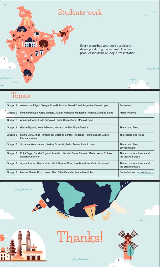 The students * will collaborate to produce an  artefact  (presentation – video etc.) that shows their path of studies on Freud and that can be a useful tool for sharing their  study and encouraging  a  reflection on the present as we are.